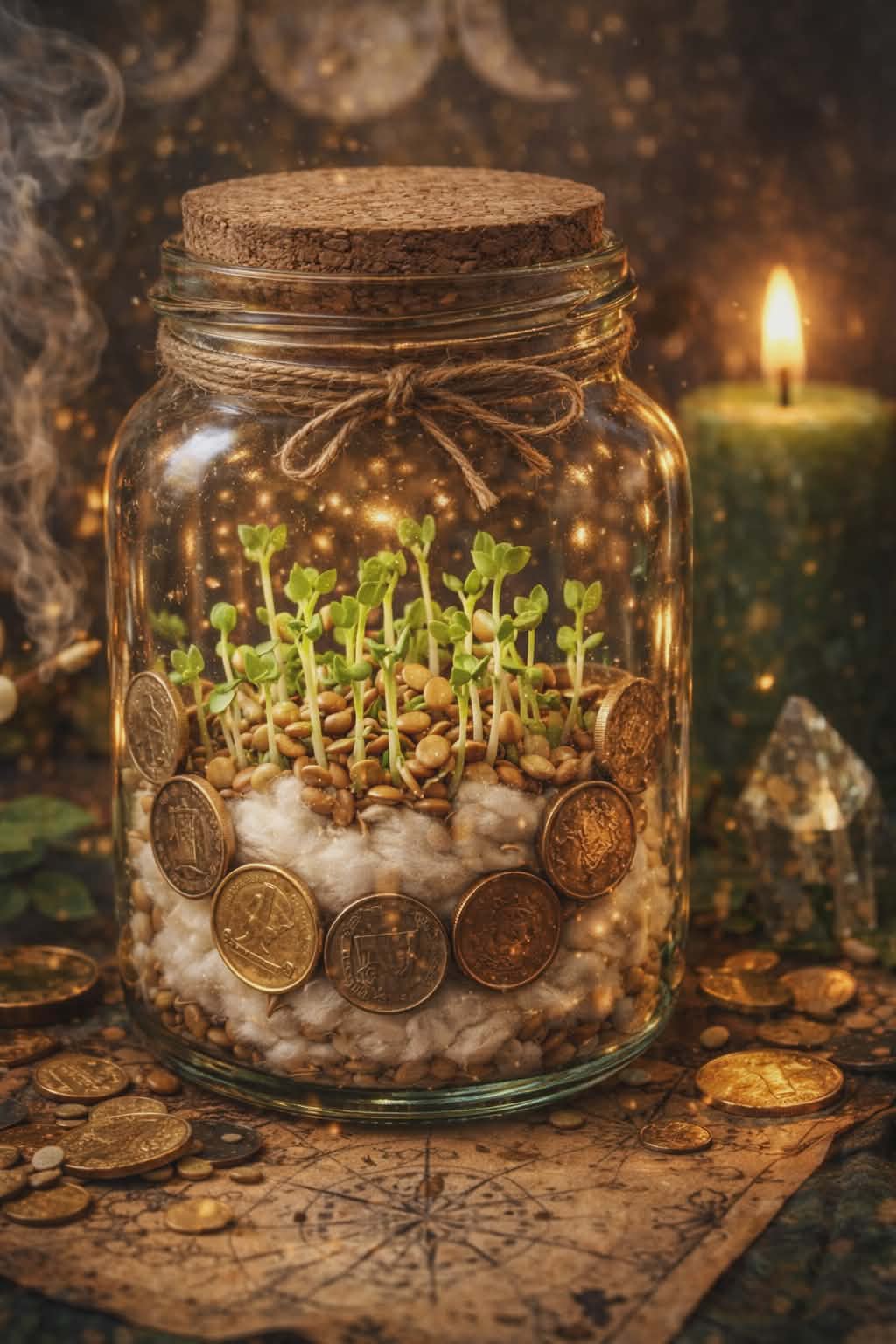 Οι φακές φυτρώναν αργά μέσα στο βάζο, και όσα φύτρωναν ήταν σημάδι πως η χρονιά θα ήταν πλούσια και ευλογημένη. Και τα νομίσματα; Κάθε μέρα που τα κοιτούσαν, τους θύμιζαν ότι η τύχη έρχεται σιγά αλλά σταθερά — σαν κύμα που χτυπά απαλά στην ακτή. Λένε πως ακόμα και σήμερα, όποιος κάνει αυτό το τελετουργικό τη νύχτα της Νέας Σελήνης, αισθάνεται την ίδια μαγεία που ένιωθαν οι παλιές μάγισσες: μια σύνδεση με τη γη, με τη Σελήνη και με τον κύκλο της ζωής, και η αφθονία μπαίνει σιωπηλά, αθόρυβα… αλλά σίγουρα.