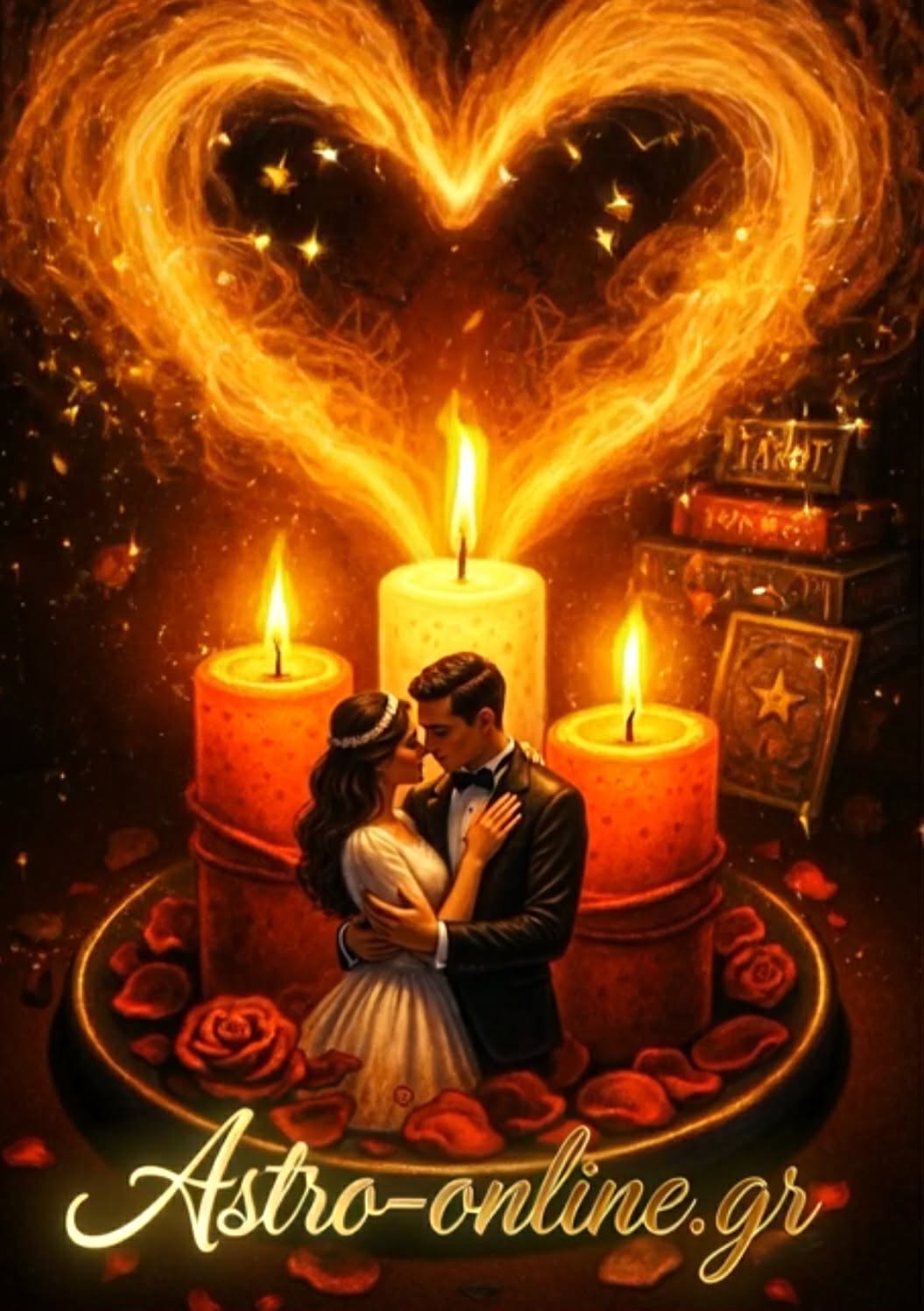 Τρία κεριά καίνε μέσα στη σιωπή του σύμπαντος. Η φλόγα τους ανεβαίνει αργά και σχηματίζει μια καρδιά από φως, σαν να γεννιέται από τις ανάσες δύο ψυχών που θυμούνται η μία την άλλη. Κόκκινα ροδοπέταλα στρώνουν τον κύκλο της ένωσης, ενώ μια λεπτή κόκκινη κορδέλα δένει απαλά δύο καρδιές — όχι με δύναμη, αλλά με υπόσχεση.